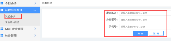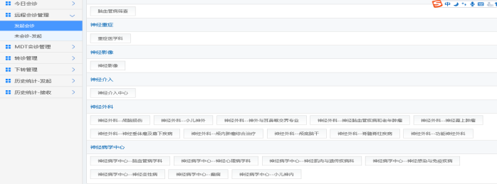4.预约专家单诊请点击远程会诊管理→发起会诊→输入患者信息→提交→选择天坛医院→根据患者病情预约相应专家(关于专家特长可查看专科联盟网页内名医名家)。