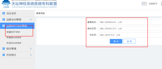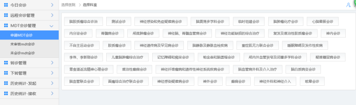 5.预约专家多学科会诊请点击MDT会诊管理→申请MDT会诊→输入患者信息→提交→选择天坛医院→根据患者病情预约相应专家(关于专家特长可查看专科联盟网页内名医名家)。